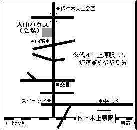 場 所 『大山ハウス』 東京都渋谷区大山町40−23 平成12年8月5日(土) OB:¥8500− OB会開催のご案内を往復葉書にて送付します。 渡辺 岳彦・轟 真也(平成5年卒) | ■ 会場地図■![]() |