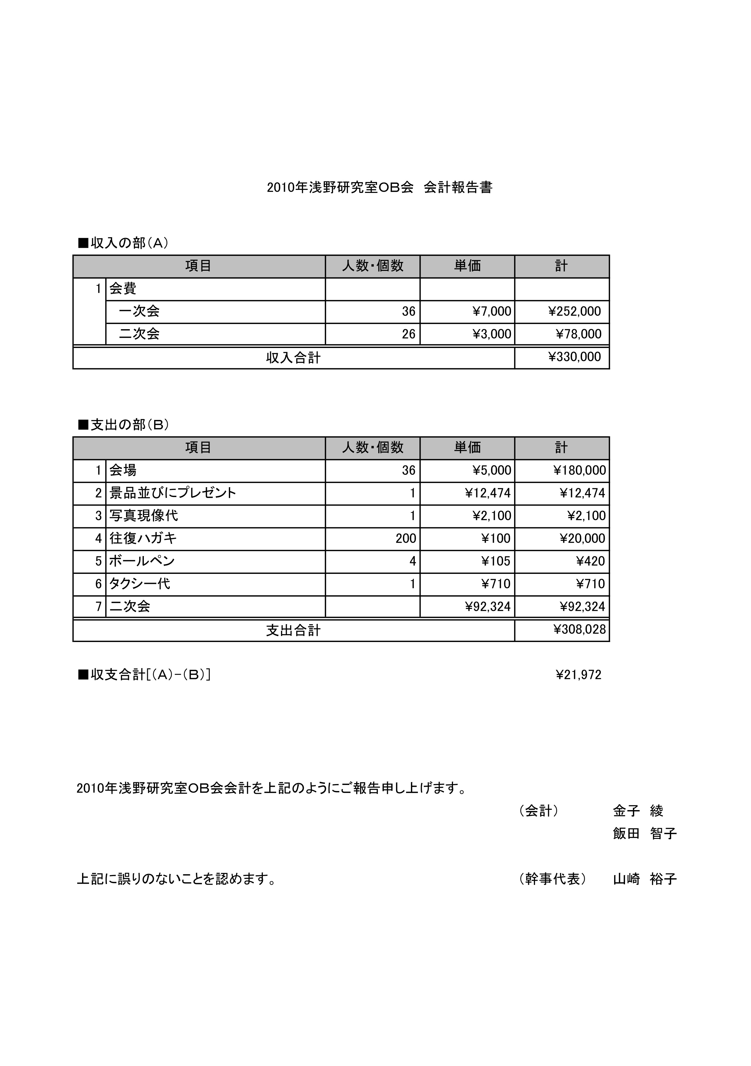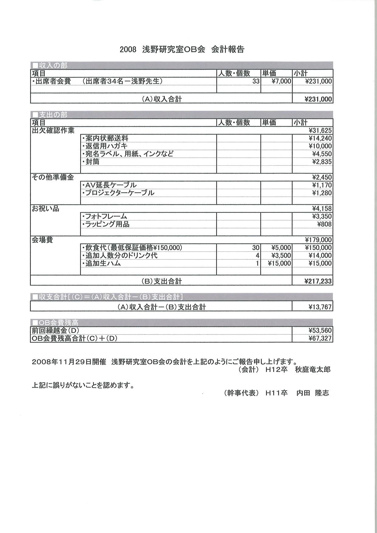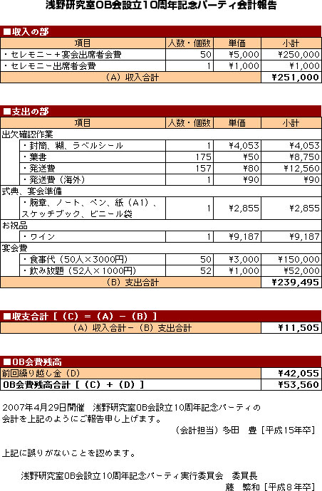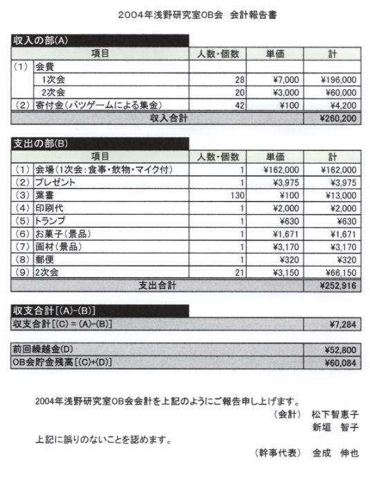 ■第1回 開催年:平成8年 開催場所:表参道 参加者数:15名(くらいだったかな?) ■第2回 開催年月日:平成11年5月1日〜2日 開催場所:東京YMCA野辺山高原センター(長野県) ※レポートはこちら ■第3回 開催年月日:平成12年8月5日 開催場所:大山ハウス(代々木上原) 参加者数:25名 ※レポートはこちら ■第4回 開催年月日:平成14年11月23日 開催場所:キャロットタワー26階「SKYCARROT」(三軒茶屋) 参加者数:33名 ※レポートはこちら ■第5回 開催年月日:平成16年3月27日 開催場所:新宿センチュリーハイアットホテル(西新宿) 参加者数:29名 ※会計報告はこちら ■第6回 開催年月日:平成19年4月29日 開催場所:日本大学浅野研究室・大久保商店街・庄屋(習志野) 参加者数:52名 ※会計報告はこちら ■第7回 開催年月日:平成20年11月29日 開催場所:Pleasaurant(渋谷) 参加者数:33名 ※会計報告はこちら ■第8回 開催年月日:平成22年10月30日 開催場所:下町DINING一の屋(門前仲町) 参加者数:36名 ※会計報告はこちら ■第9回 開催年月日:平成24年10月27日 開催場所:神谷バー(浅草) 参加者数:33名 ※開催告知HPはこちら |